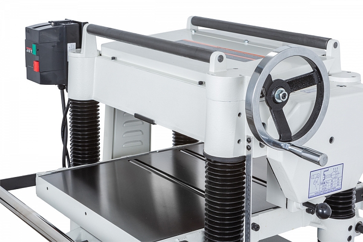 Jet JWP-208-3 — мощный и производительный рейсмусовый станок профессионального класса для частных мастерских с большими объёмами работ и для поточного производства на промышленных предприятиях. Массивная (300 кг), устойчивая и жёсткая конструкция имеет стандартную для среднеразмерных станков компоновку: строгальный узел с мотором и механизмом подачи закреплён неподвижно. Для регулировки просвета и, соответственно, толщины снимаемого слоя стол перемещается по четырём колоннам. «Лифт» производится вращением маховика с рукояткой, после регулировки положение стопорится винтовыми зажимами. С верхней стороны моторного модуля есть вальцы для обратной подачи заготовки. Ролики в поверхности стола, снижающие трение заготовки, установлены на эксцентриковых осях для простой и удобной регулировки выступа над его уровнем.