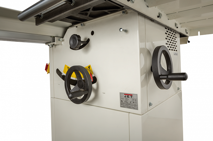 Циркулярная пила Jet JTS-600XL – уникальный по сочетанию характеристик и стоимости станок. Уже в базовый комплект поставки входит подвижный стол (каретка) и расширение к нему. Расширитель укомплектован регулируемой телескопической опорой и торцевым упором заготовки. Торцевой упор выполнен поворотным, что позволяет делать распилы под точно установленным углом. Для фиксации заготовки можно использовать регулируемый концевой ограничитель; в случае ненадобности он откидывается.