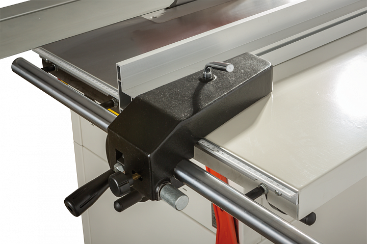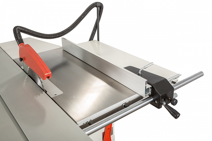 Основа конструкции пилы – металлическая тумба, внутри которой установлены асинхронный трехфазный двигатель, механизмы регулировки по высоте и углу наклона пильного модуля (он выполнен из чугунной отливки) и пылесборный кожух со 100-миллиметровым патрубком подключения к вытяжной установке. Рабочий стол чугунный, вдоль него проходит жесткая цилиндрическая направляющая, по которой перемещается параллельный упор с эксцентриковой фиксацией – эти решения полностью соответствуют профессиональному стандарту. Рабочая поверхность может быть увеличена за счет установки расширителя и удлинителя, сделанных из листовой стали – они штатно поставляются вместе с пилой.